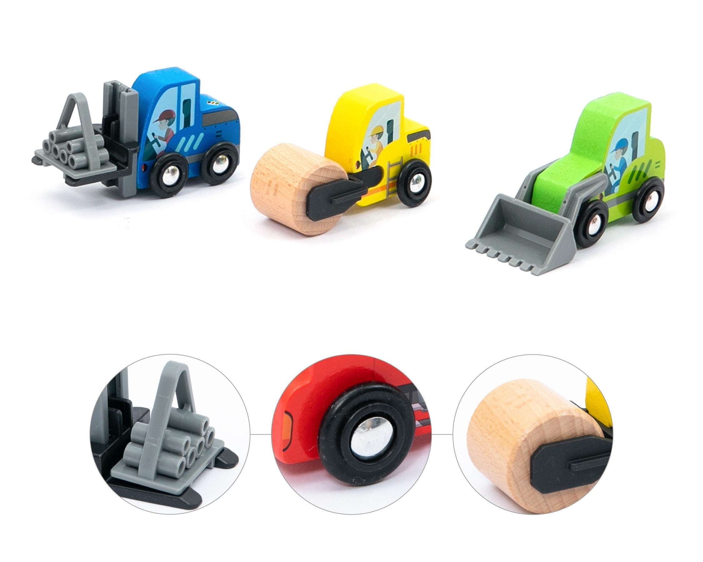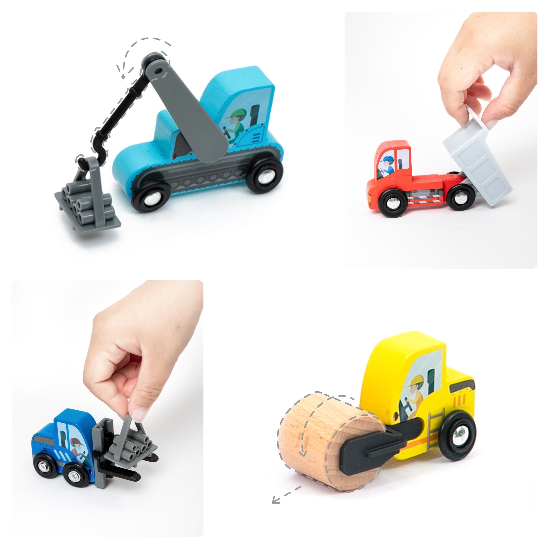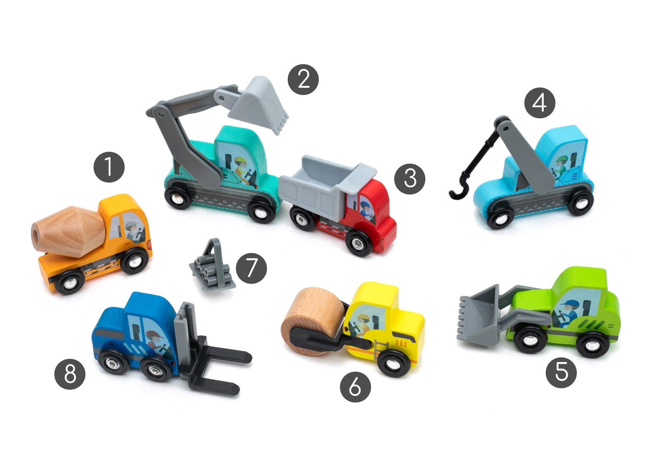 Tato dřevěná hrací sada obsahuje: 1.) míchačku na beton, 2.) bagr, 3.) nákladní auto, 4.) jeřáb, 5.) čelní nakladač, 6.) válec, 7.) potrubí, 8.) vysokozdvižný vozík.
