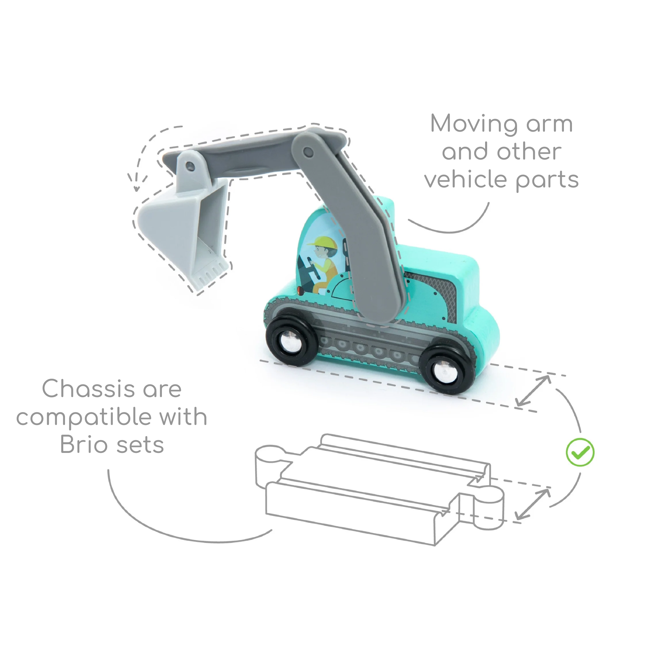 Sada je kompatibilní s Brio World železnicemi, Eichhorn železnicemi a dalšími běžnými železnicemi. Většina vozidel má pohyblivá ramena nebo jiné pohyblivé části. Například: vysokozdvižný vozík může zvednout a vyzdvihnout náklad trubek, malý jeřáb může tento náklad také přepravit atd.
