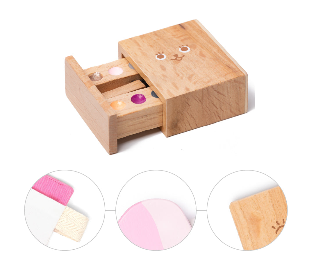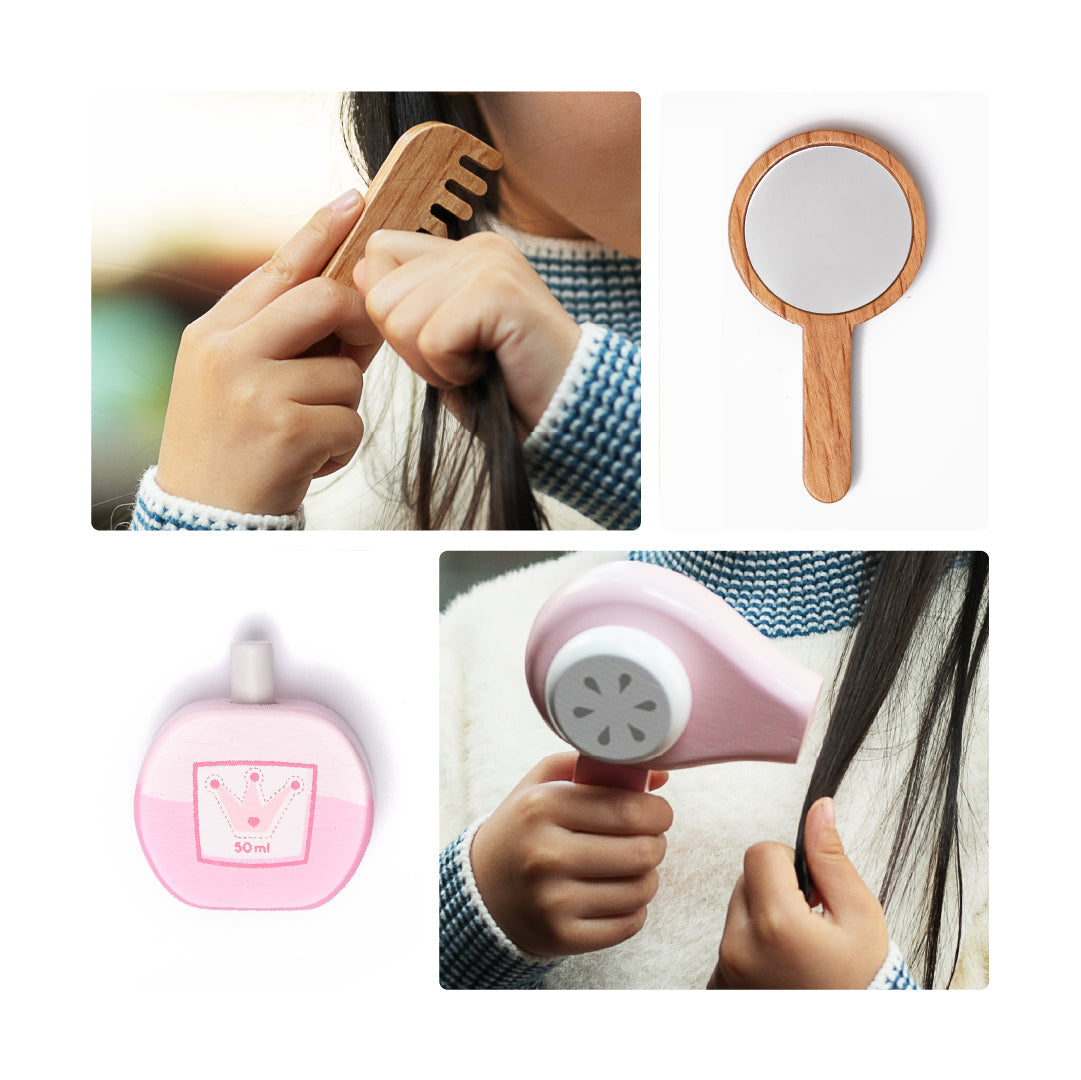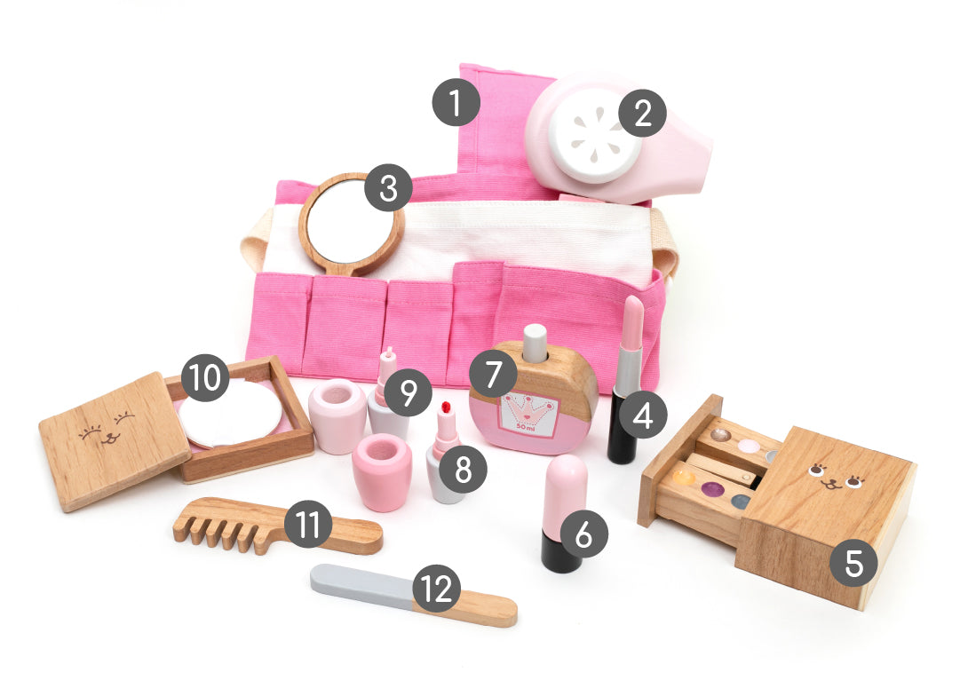 This wooden play set contains: 1.) 2.) Hair dryer, 3.) 4.) Lipstick, 5.) 6.) Eye shadow set, 6.) Lip balm, 7.) Perfume, 8.) Nail polish 1, 9.) Nail polish 2, 10.) Make-up sponge, 11.) Comb and 12.). Nail file