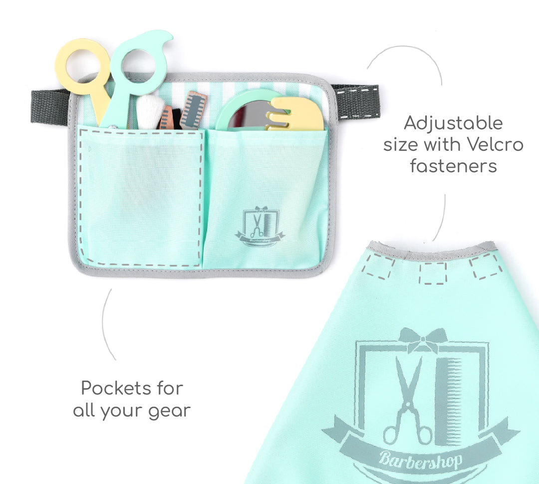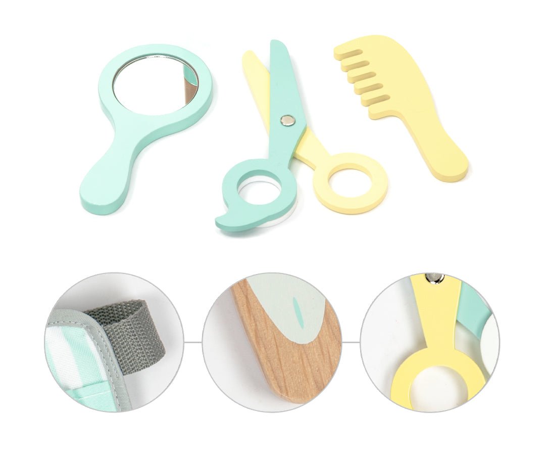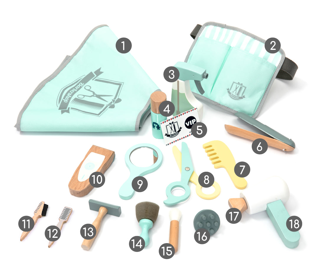 Ten drewniany zestaw do zabawy zawiera: 1.) 1.) Kołnierz fryzjerski, 2.) Torbę narzędziową, 3.) Spray do wody, 4.) Piankę do golenia, 5.) Kartę klienta VIP, 6.) Prostownicę do włosów, 7.) Grzebień, 8.) Nożyczki, 9.) Torbę fryzjerską. ) Lustro, 10.) Golarkę elektryczną, 11.) Szczotkę do rzęs, 12.) Nóż fryzjerski, 13.) Brzytwę, 14.) Pędzel do golenia, 15.) Szczotkę do włosów, 18.) Suszarkę do włosów + 16.)/17.) Nakładkę 1 i Nakładkę 2.