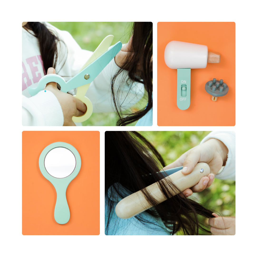 Zestaw do zabawy jest tak realistyczny, że dziecko może natychmiast stworzyć wszelkiego rodzaju fryzury jak prawdziwy fryzjer. Zestaw zawiera naprawdę funkcjonalne przedmioty - prostownica do włosów może być używana do prostowania włosów, nożyczki mogą być „cięte”, końcówki suszarki do włosów mogą być zmieniane itp.